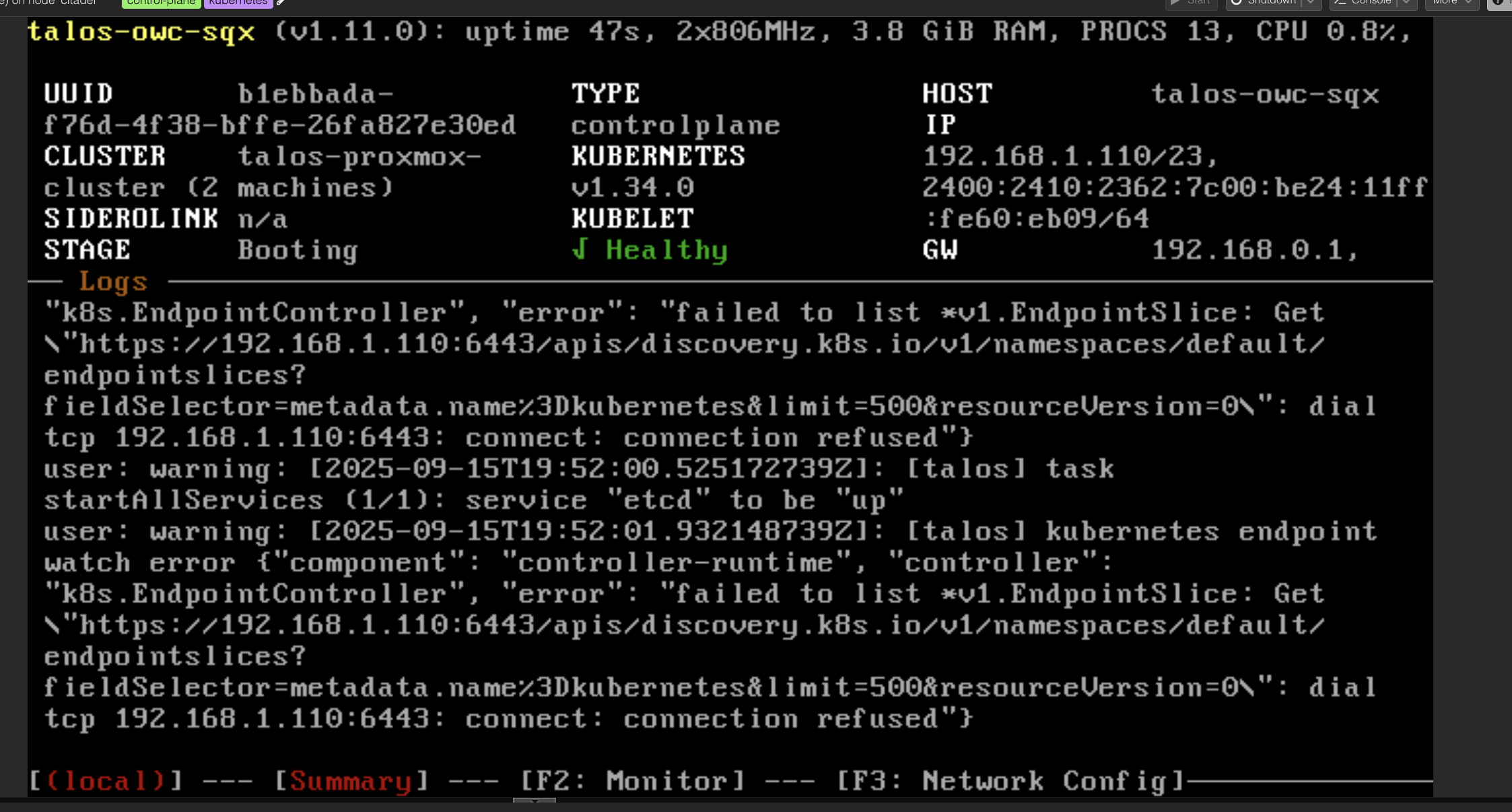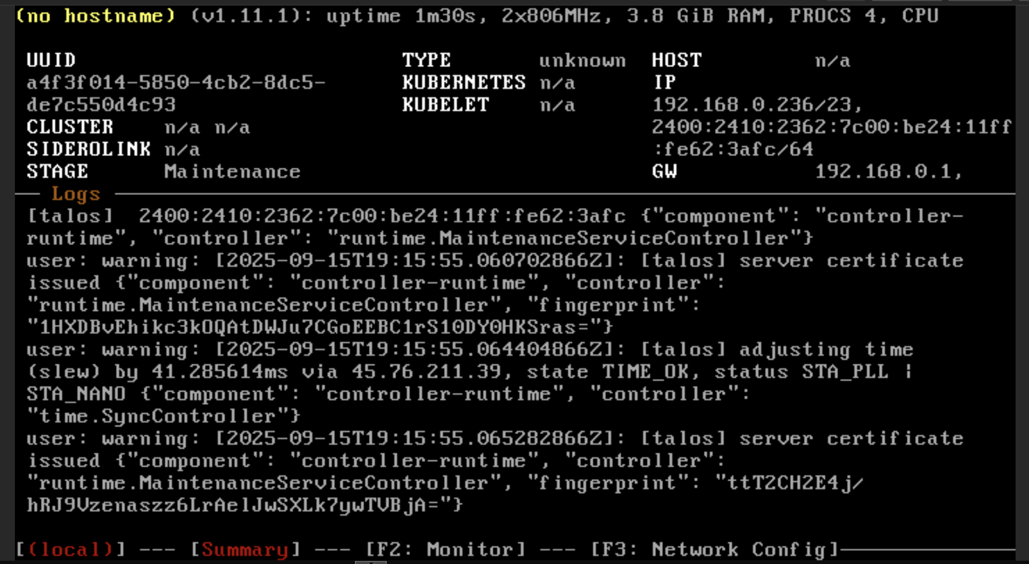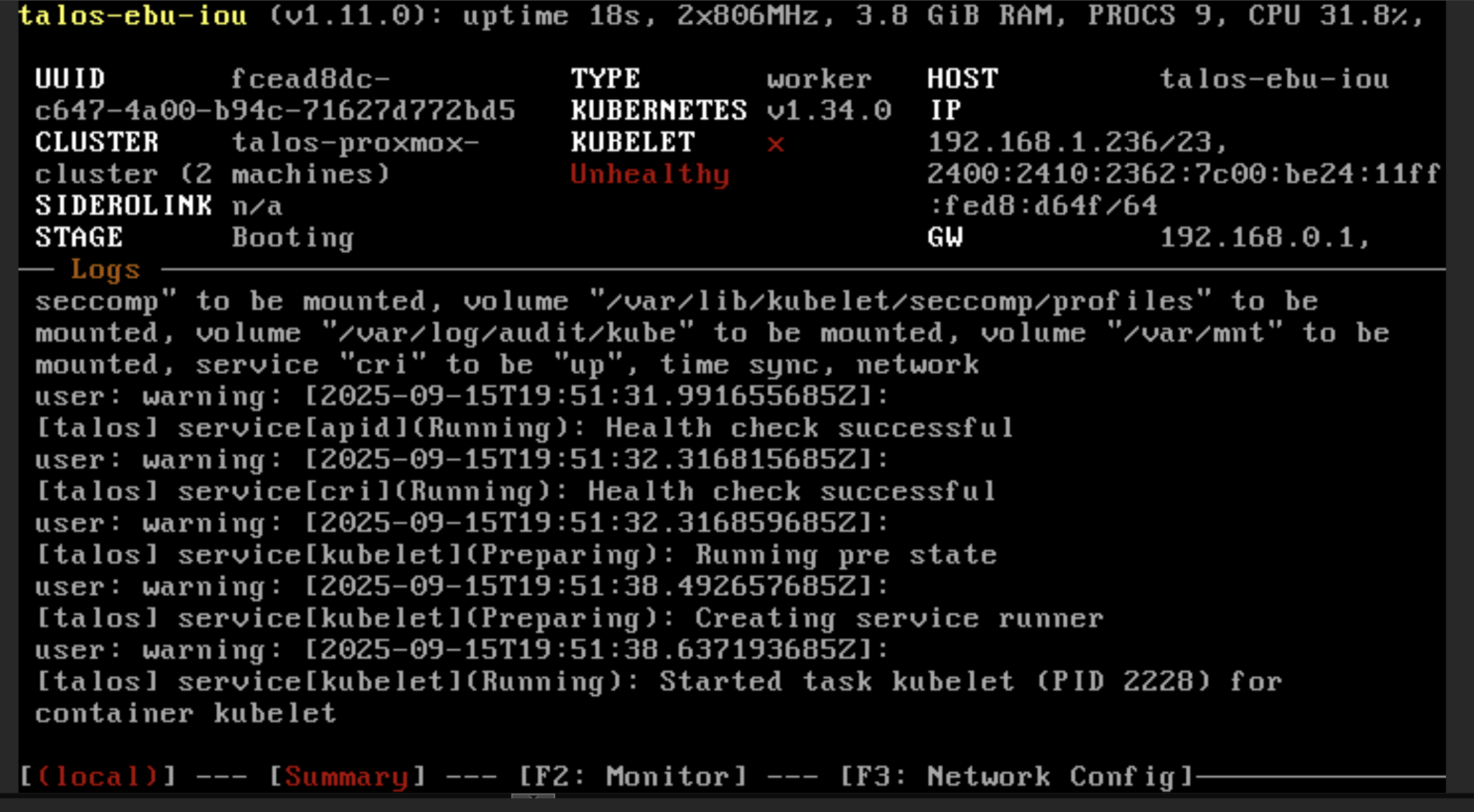 talosctl --talosconfig $TALOSCONFIG apply-config --insecure --nodes $CONTROL_PLANE_IP --file _out/controlplane.yamlApply again for our worker